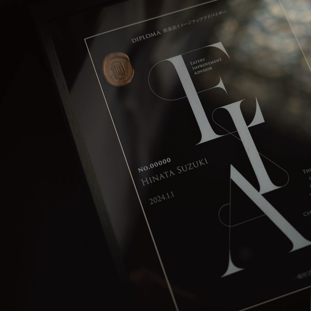 飲食店イメージアップアドバイザー専用ディプロマ|選ばれた人だけの特別な証 高級ディープマットブラック紙と手押しのシーリングスタンプで仕上げた、飲食店イメージアップアドバイザー専用ディプロマ。額縁付きで長く美しい状態を保ちます。 ○高級感あふれる紙質 ディープマットブラックの質感とホワイト印刷が、洗練されたデザインを引き立てます。 ○手作業で仕上げるシーリングスタンプ 一つ一つ手押しで施されたシーリングスタンプが唯一無二の価値を演出。 ○安全で軽量な額縁 割れにくく軽量なPS板を使用した高品質な額縁で、長く美しい状態を維持。 ○プレミアムな唯一性 記載内容(アドバイザーNoやお名前)が個別に印刷されるため、世界に一つだけのディプロマ。 ──────────── ○簡単3ステップでお手元に 1.情報入力:お名前をフォームに記入し、購入。 2.LINE登録:ご購入後、公式LINEにご登録いただき、トーク画面にお名前をお送りください。 LINE登録 ☞ https://lin.ee/2aaYs6E 3.デザイン確認:提出いただいた内容を元にLINEにてデザイン案をご確認いただきます。 4.お届け:デザイン決定後、約2週間でお手元にお届けします。 ──────────── 額縁外寸法 : W276×H363×D30mm マット外寸法 : W261×H348×D1mm マット中抜寸法 : W190×H277mm 重量 : 約540g 取り付けタイプ:壁掛け フレームの素材:樹脂・木材 ──────────── ○よくある質問 「シーリングスタンプは全て手作業ですか?」 → 「はい、職人が一つ一つ丁寧に押しています。」 「額縁はどんな素材ですか?」 → 「軽量で割れにくいPS板を使用しています。」
